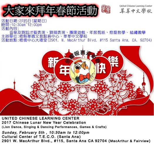 2017’s Chinese Lunar New Year is approaching! This year our school has received a special invitation to host the celebration event at Cultural Center of T.E.C.O. in Santa Ana. The program includes lion dance, student performances and many fun activities. It is an honor to share this special festival with our community and we sincerely invite all UCLC families to come and celebrate with us.